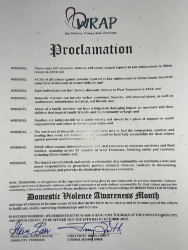 Obion County Mayor Steve Carr and General Session Judge Jimmy Smith, joined by The Wo/Men’s Resource and Rape Assistance Program, signed a proclamation declaring October as Domestic Violence Awareness Month in Obion County.