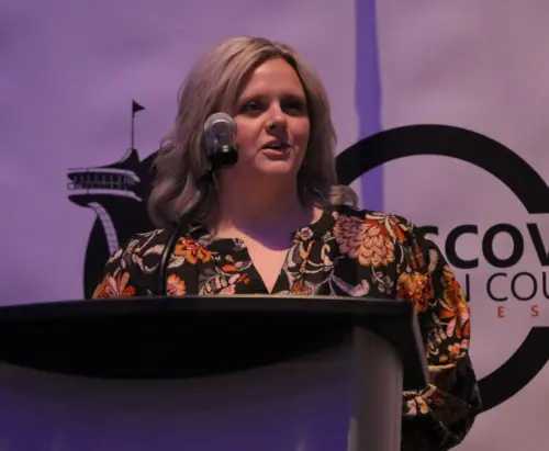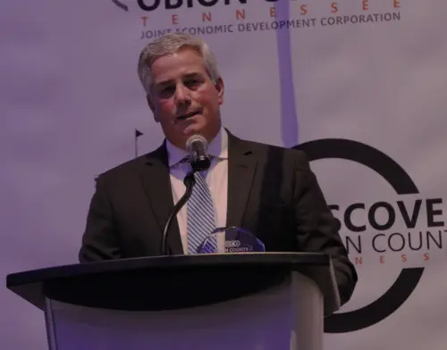 Award winners at the Obion County Joint Economic Development Corporation/Chamber of Commerce banquet at Discovery Park of America. Tammy Ursery-Tourism Partner of the Year; Lauren Kendall-Ambassador of the Year; Joe Ward accepting for First Citizens National Bank-Business of the Year; and Clint Joiner- Past President Award.