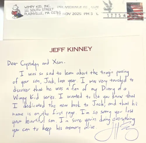 “It was so kind of him,” Crystalyn said. “We actually received his letter on a day that was tough for us because of the approaching holidays. It was touching and just what we needed that day. I don’t really know how Jack got interested in the Diary of a Wimpy Kid series. He just loved reading, and that started at an early age with comics, when he read everything he picked up. He found the first book in the series at school and checked it out, and he’d always pull it out to read when he had a little extra time.”